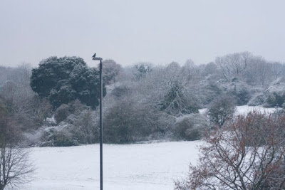 Ilyen nagy szurke-feherseg van, meg csend. Reggel megint esett a ho, gyonyoruen, suruen, csak ugy szakadt, de valahogy nem eleg. Korulottunk mindenhol all a vilag, nem mennek a kamionok, nem mennek a repulok, eszak es del is be van havazodva... Bristol meg itt van kozepen a kis ketcentivel.