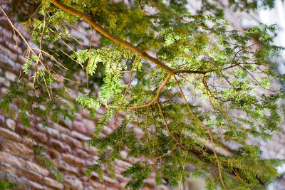 5)[játékos fényfoltok a tiszafán a ház előtt]